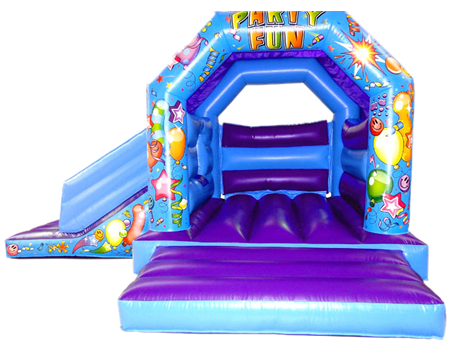 This classic Bounce 'n' slide A-frame design incorporates a 5 ft slide at the side, allowing for high walls and maximum space to be utilised inside. Party themed artwork also means that is suitable for all ages, gender and party themes. With modern electric blue and purple colours this bouncy castle really cathes the eye.